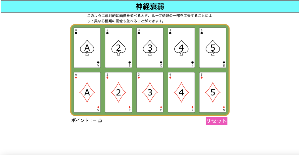 先ほど画像のパスを配列cards[]の中に格納したのでした。ここではループ文の中でそれらのパスを順番に指定した<img>タグを生成し、すべて変数textに書き加え、最後に.innerHTMLでHTMLを書き換えて全てを表示させます。